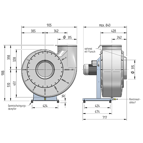 Korrosionsbeständiger Kunststoff-Radialventilator mit Gehäuse aus PE-el, elektrisch ableitfähig, in gesinterter Ausführung, einseitig saugend, Einlaufdüse mit Dichtung als Inspektionsöffnung, leicht demontierbar, Kondensatstutzen an tiefster Stelle des Gehäuses, Splitterschutz gemäß UVV als kunststoffbeschichtetes Drahtgeflecht. Laufrad PP-el mit rückwärts gekrümmten Schaufeln, elektrisch ableitfähig, statisch und dynamisch ausgewuchtet, Auswuchtgüte mindestens G 6.3 (DIN ISO 21940-11), mit Taperlock- Buchse auf der Motorwelle befestigt. Ventilatorgestell in kräftiger Stahlschweißkonstruktion in verzinkter Ausführung, mit Motortragplatte. Ventilatorgestell geeignet zur Aufnahme des Ventilatorgehäuses mit Laufrad sowie des Motors. Minimalspaltdichtung am Wellendurchgang.Gummischwingungsdämpfer und elastische Manschetten mit VA-Spannbändern für Saug- und Druckseite sind im Lieferumfang enthalten.