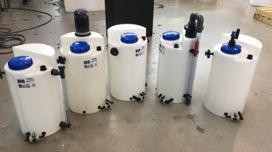 Die eingeformte Literskala der Dosierbehälter, ermöglicht das Ablesen des Füllstandes und die Flachstellen die Montage von Armaturen und Behälterdurchführungen. Bei der Aufstellung der Dosierbehälter mit Rührwerken, werden im unteren Bereich Befestigungswinkel integriert, damit das Wandern des Dosierbehälter verhindert wird.